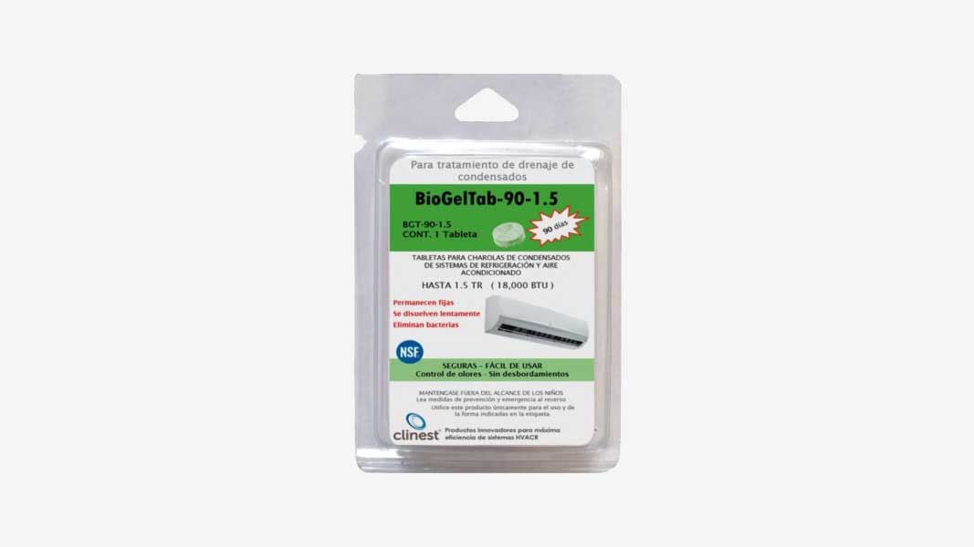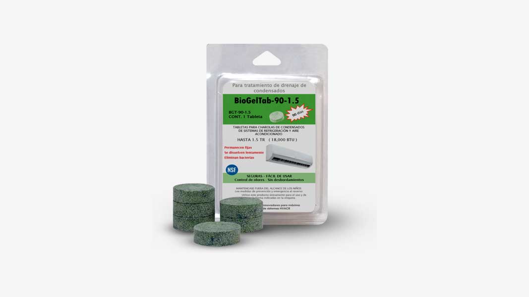 Las Bio Gel Tabs 90 son tabletas que al contacto con el agua se fijan sobre la charola de condensados. Poco a poco, sueltan su fórmula a través de toda la bandeja, formando una capa de gel que previene la acumulación de sarro, evitando así que se tape el drenaje para que no exista un desbordamiento y goteo en el equipo. Su fórmula contiene un agente antibacterial que elimina bacterias y hongos causantes del mal olor. Protección que se mantiene durante 90 días en equipos de hasta 2 TR.