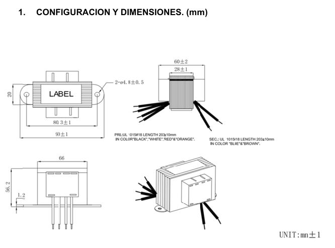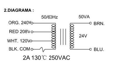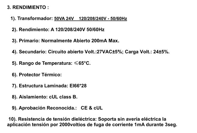 Secundario: Circuito abierto Volt.: 27VA 5%; Carga Volt: 24 +-5%